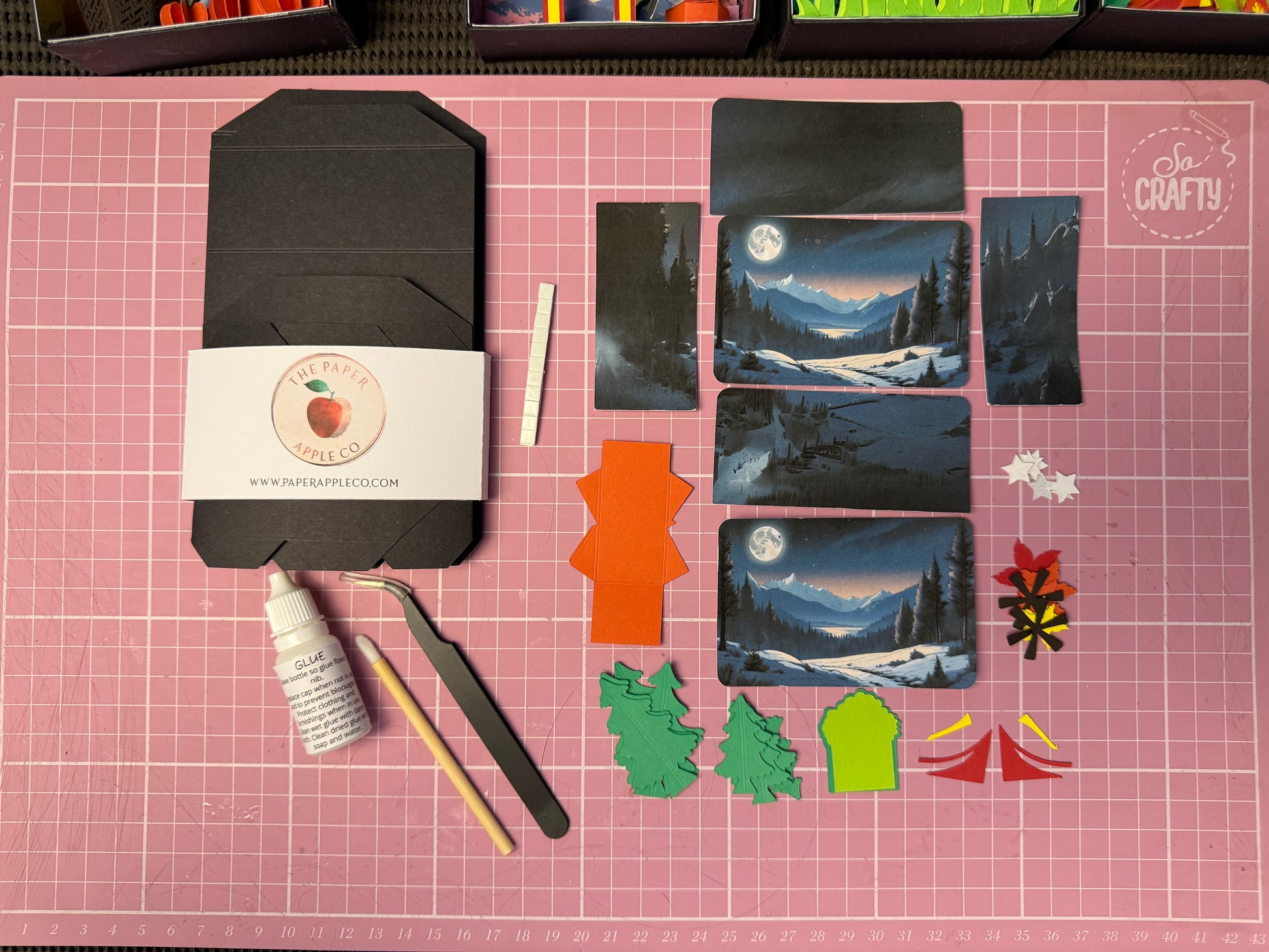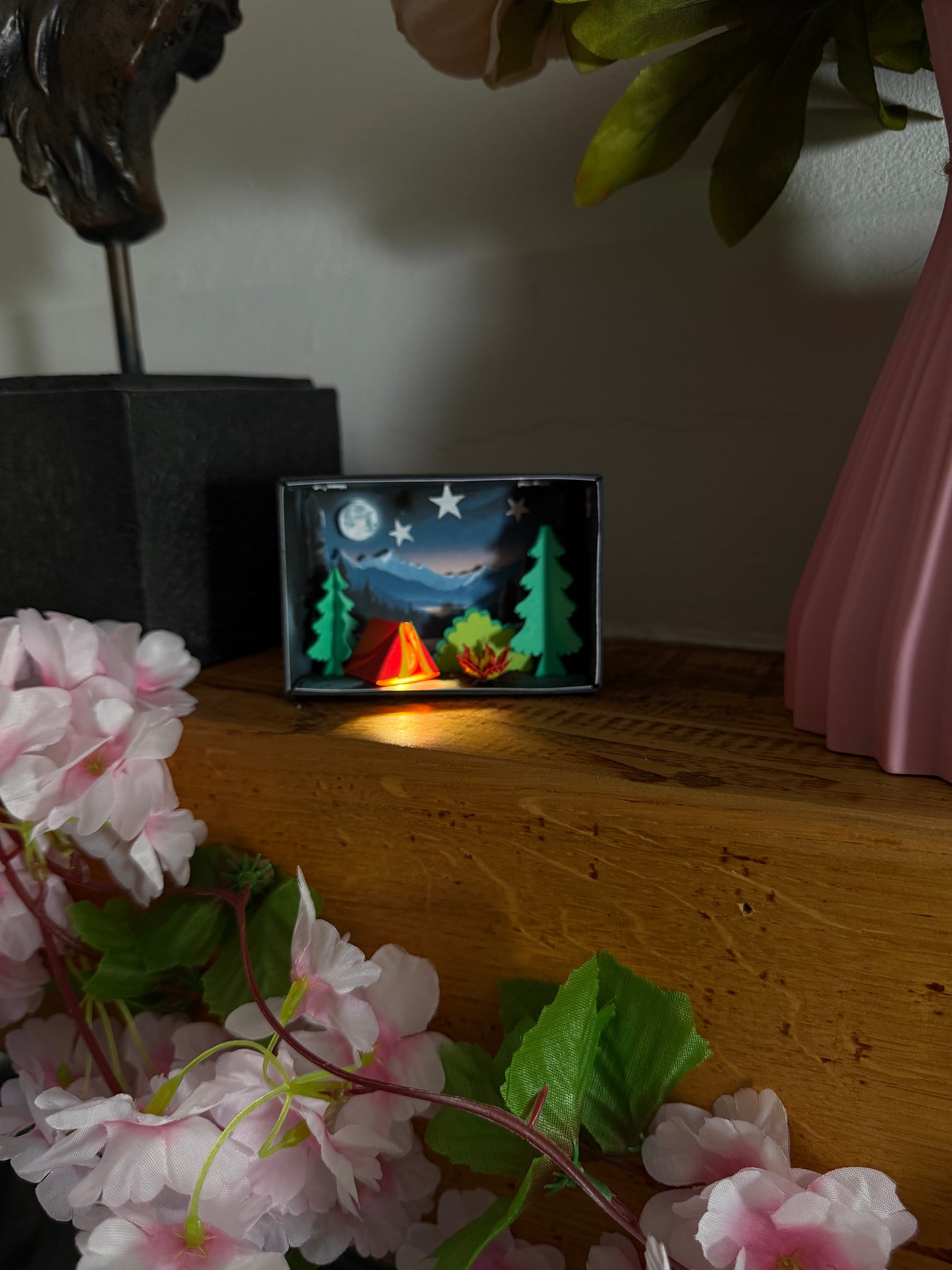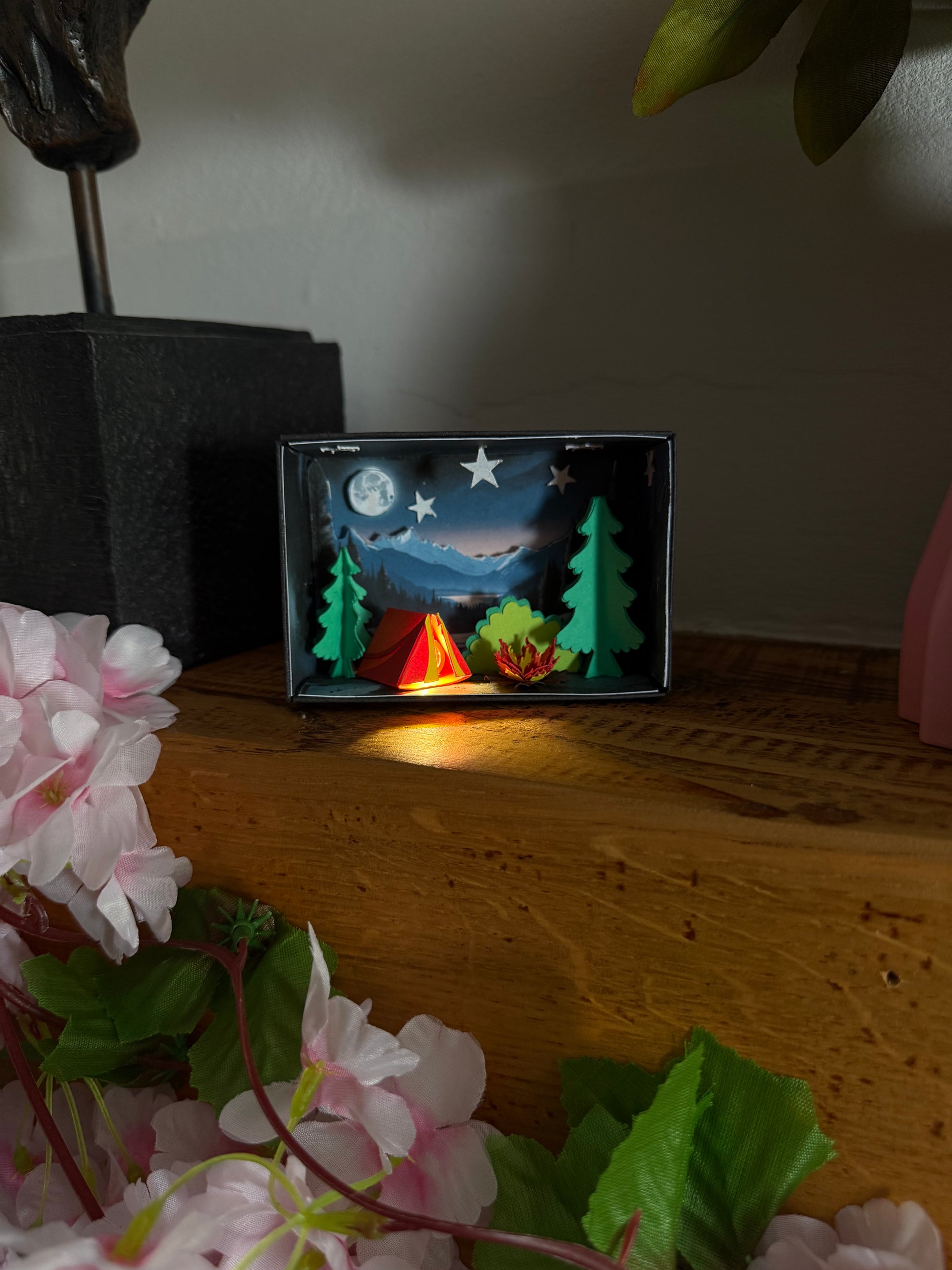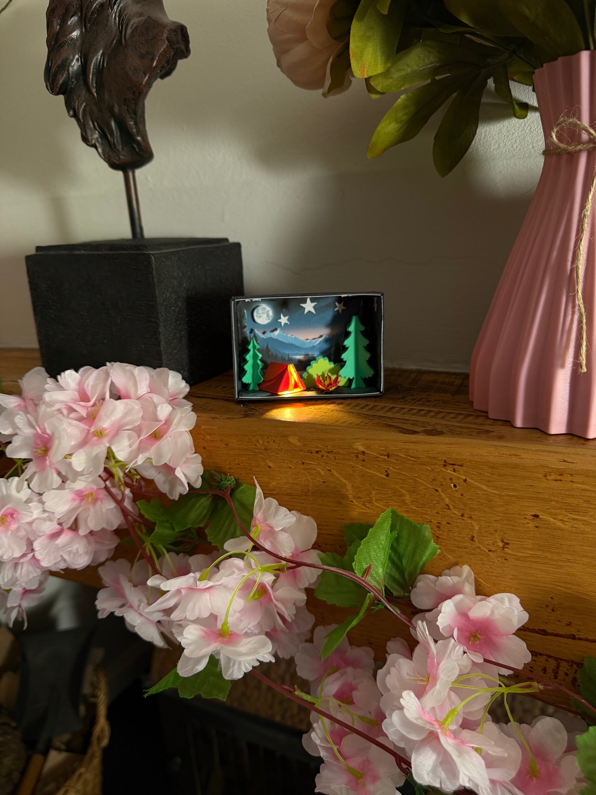 This DIY kit lets you craft your own miniature camping scene — complete with a cosy paper tent, trees, bushes, a flickering fire, stars, and a crescent moon. Everything is pre-cut by hand, and full printed instructions are included to guide you step-by-step.